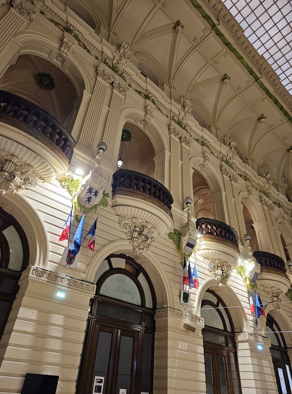 Merci aux employées de la Mairie de Tourcoing de m’avoir permis de prendre ma photo sur le sol du grand hall. Pour vous montrer l’ambiance générale, voici la photo dézoomée et le hall majestueux !