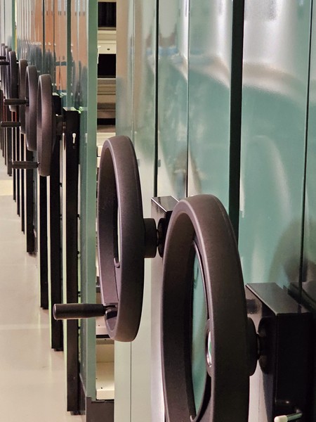 Il y a ici des kilomètres de rayonnages, et j’ai eu la chance de pouvoir tourner une des manivelles qui actionne ce qu’on appelle un compactus, à savoir ces grandes étagères roulantes posées sur des rails. J’avais à peine tourné la manivelle d’un centimètre que déjà tout le rang avait bougé, c’est impressionnant ! 🛞