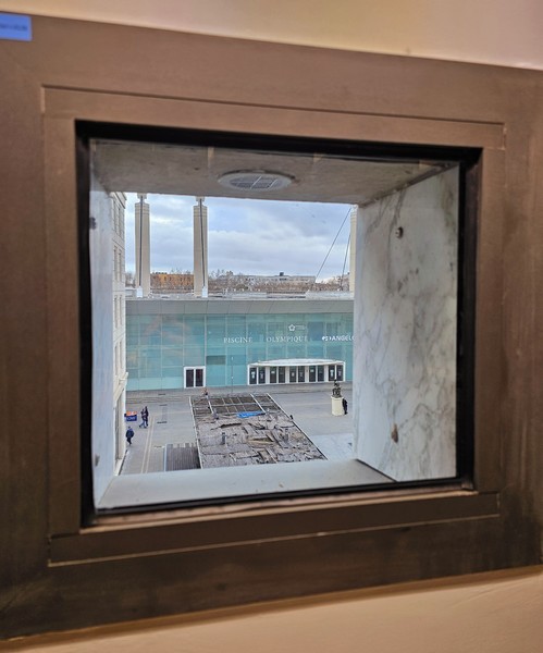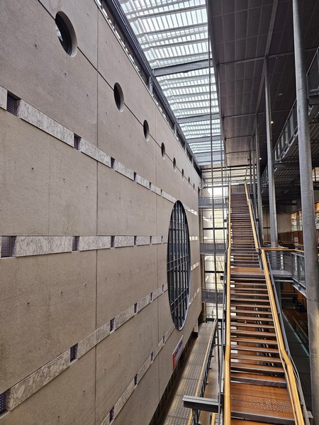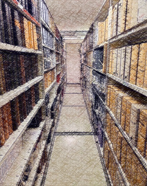 Nous passons avec notre guide de l’autre côté de ce gigantesque bâtiment ressemblant à un paquebot, coupé en deux par les grands escaliers. Ça y est, cette fois-ci nous sommes du côté des archives.🗝 (par respect pour le guide, j’ai transformé ces photos en dessins ! 😉)